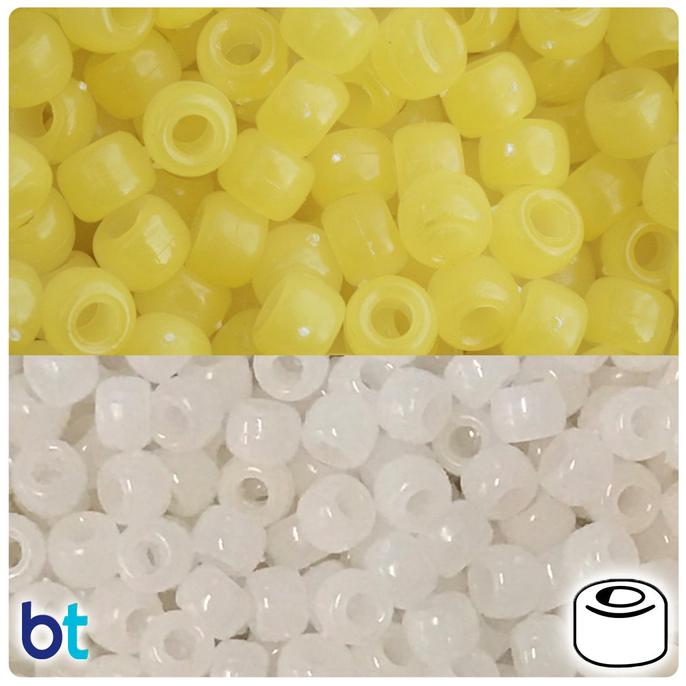 Our yellow, in a sunshine finish barrel shaped plastic pony beads, measure 6mm high by 9mm wide and have a 4mm hole which runs vertically down the middle of the bead. These plastic pony beads are UV, black light and sunlight reactive, shades of the color may vary depending how they they are charged. These beads are made in the USA with high-quality, non-toxic polystyrene plastic and sold in packs of approx. 200 beads. Pony beads are ideal for a wide variety of projects like; necklaces, bracelets, kandi and dream catchers. The larger hole is easier to thread so makes them perfect for children's parties, activity camps and VBS.