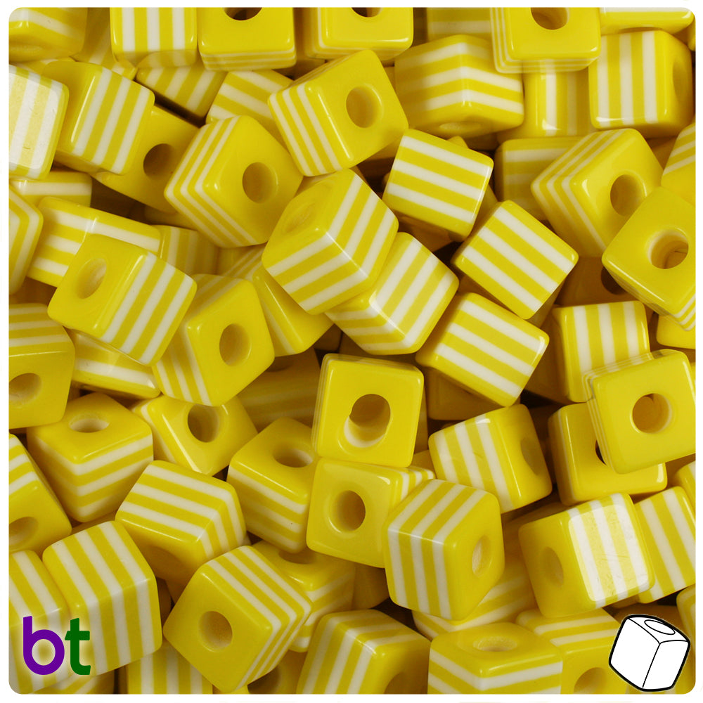 These yellow & white cube resin striped beads measure 10mm cube with a 3mm hole which runs through the center of the bead. Our resin craft beads are imported from China and these come in packs of approx 100 beads.